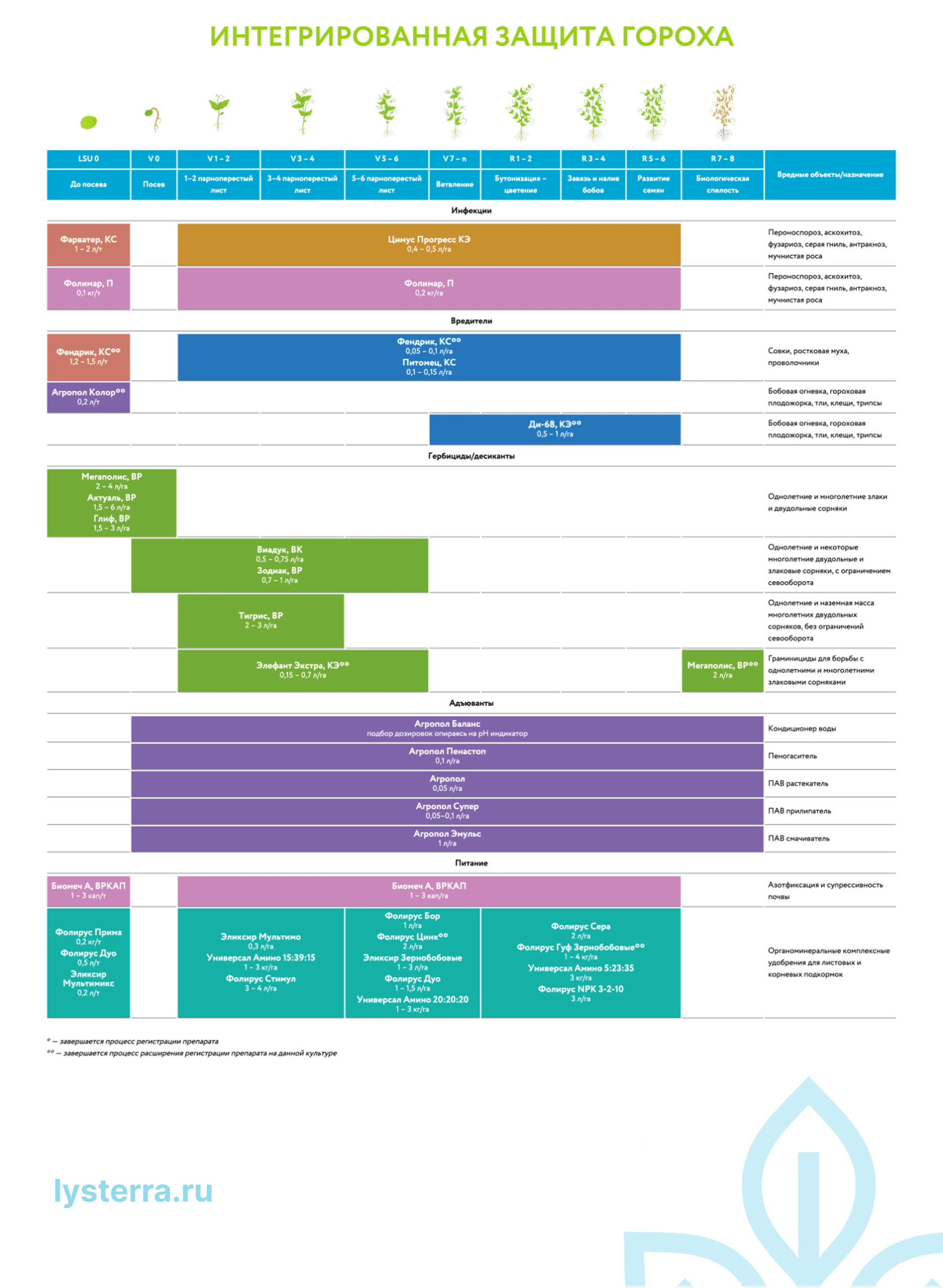 Чтобы получить хороший урожай и сохранить его, рекомендуется использовать комплекс препаратов. Для защиты культуры в портфеле компании Листерра есть всё необходимое — гербициды для гороха, протравители семян, инсектициды, удобрения и многое другое.