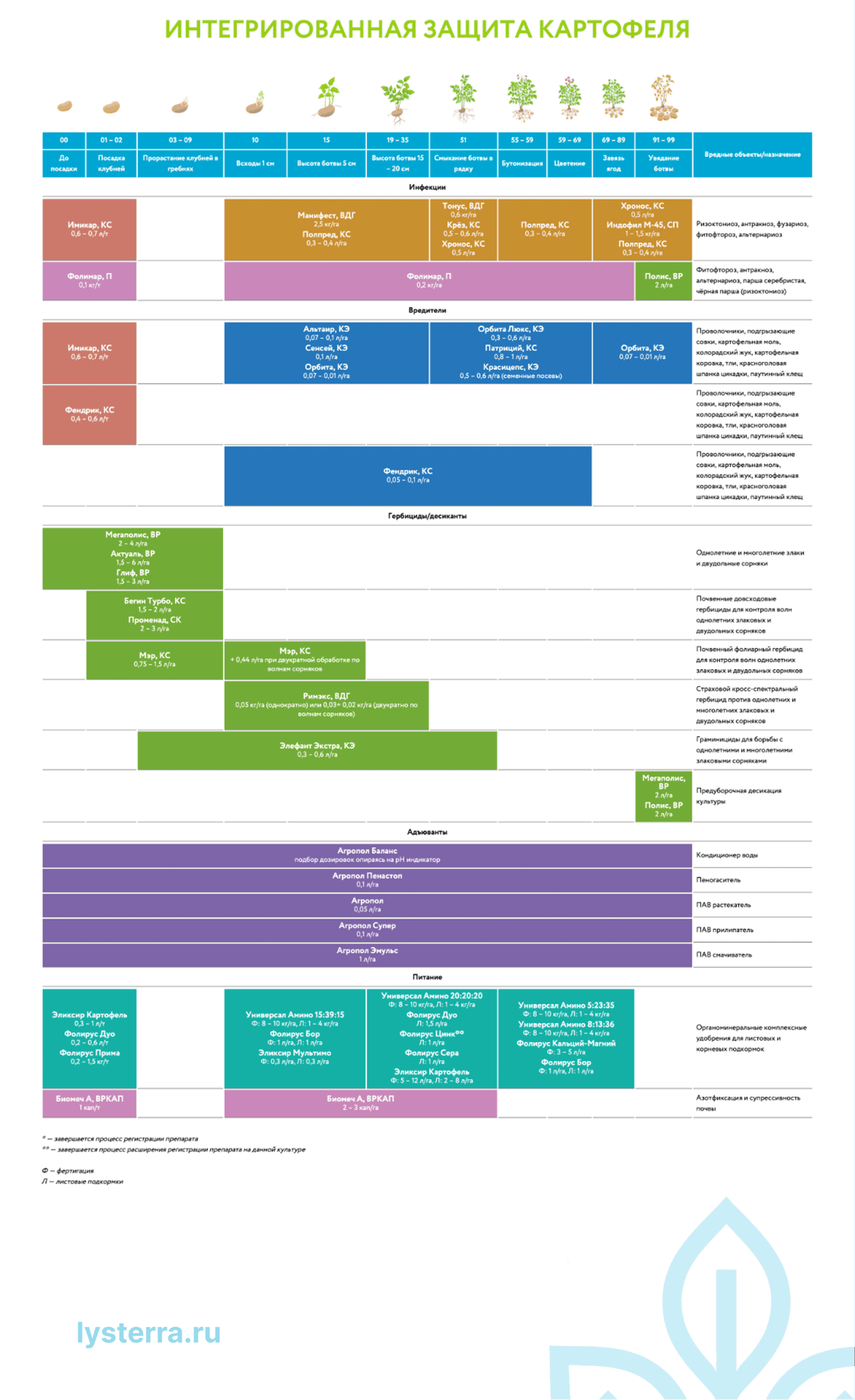 Вышеперечисленные инсектициды для картофеля можно использовать как раздельно, так и совместно в рабочих растворах. Интенсивность обработки — каждые 10 — 15 дней в зависимости от погодных условий и складывающейся фитосанитарной обстановки.