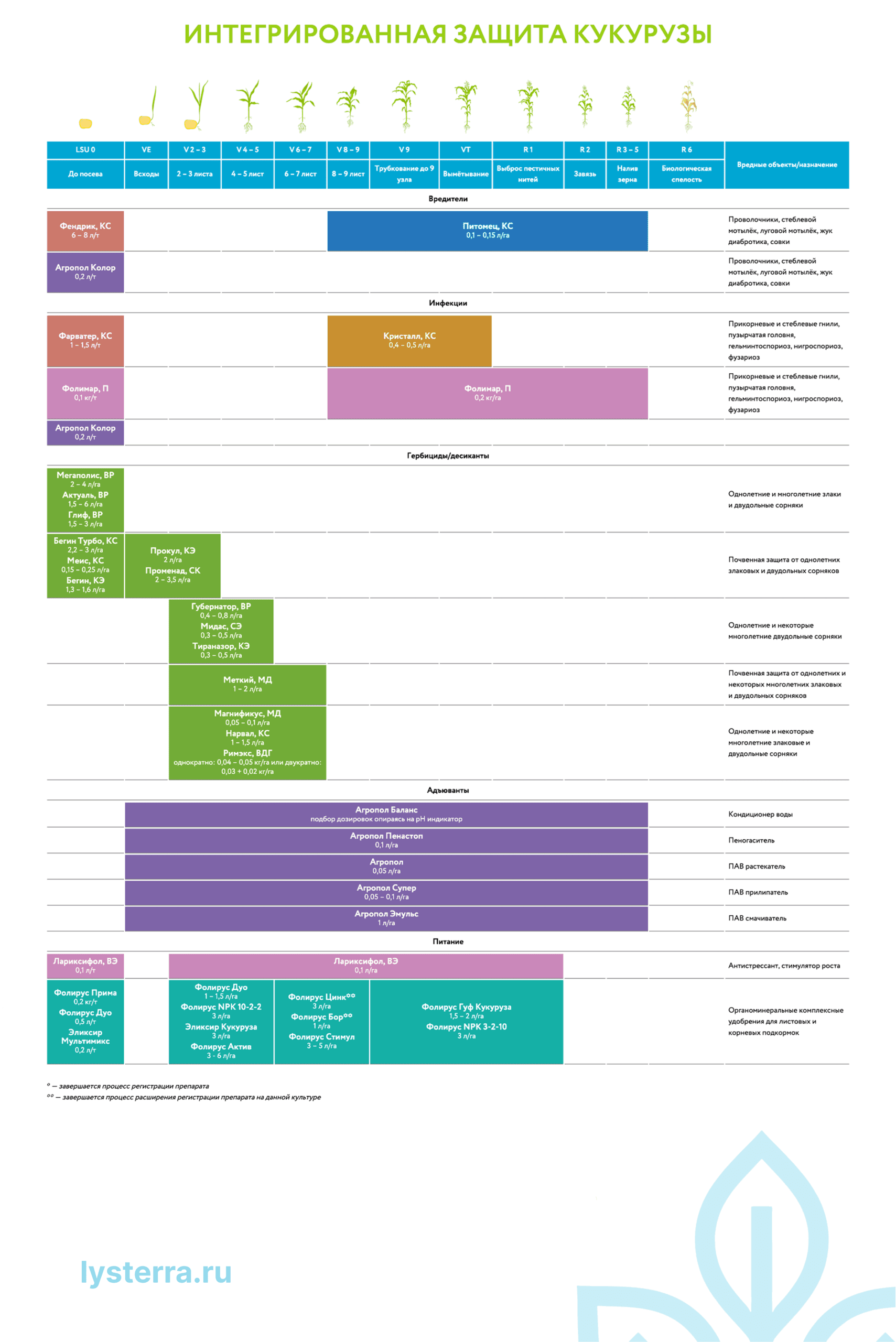 Качественная защита кукурузы от болезней, сорняков и вредителей требует комплексного подхода. В ассортименте российского производителя Листерра вы найдете полный перечень препаратов, необходимых для защиты кукурузы и других сельскохозяйственных культур. При грамотном применении пестицидов и удобрений от Листерра прибавка урожая составит от 15 до 35%.