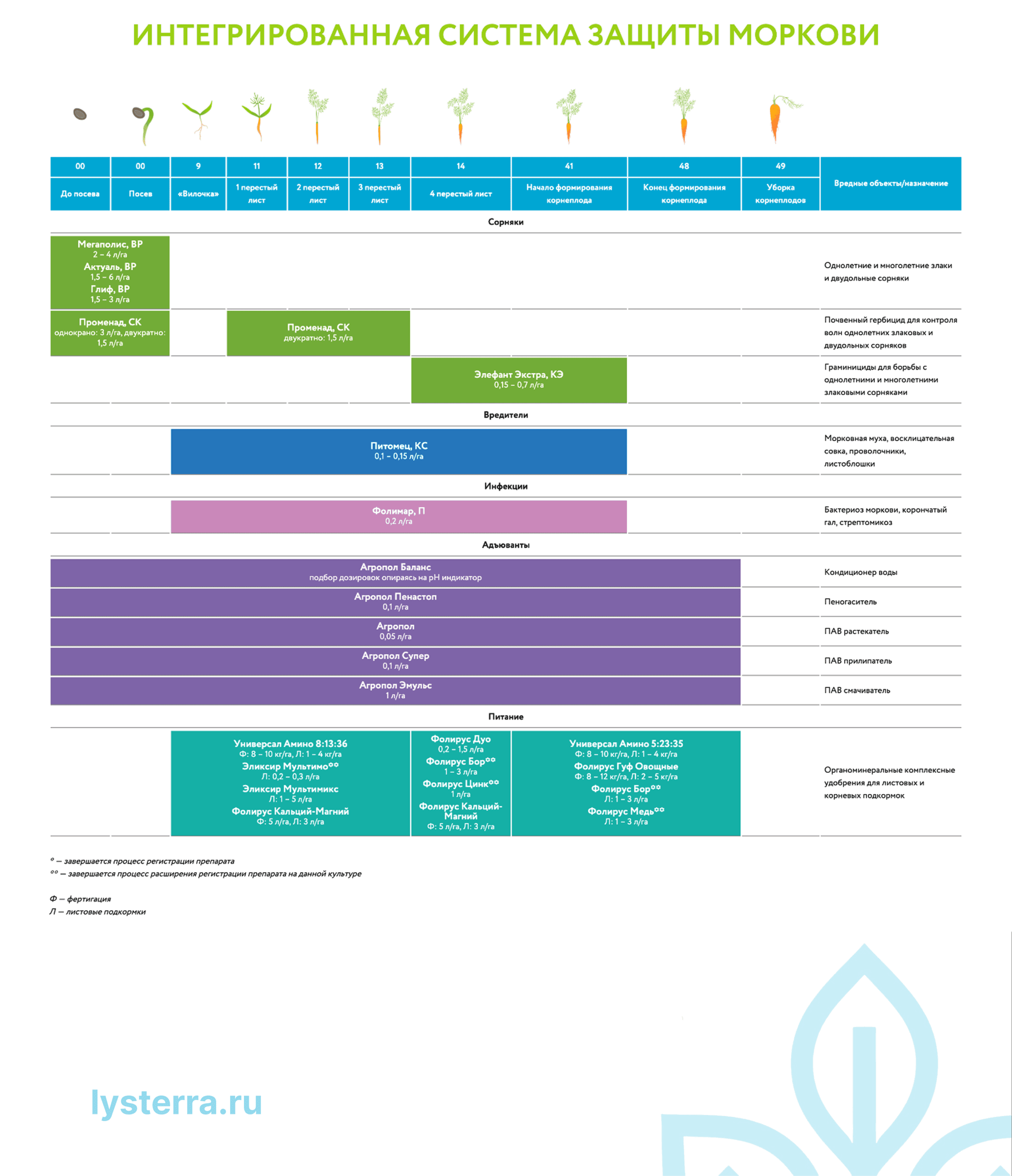 Возделывание моркови требует системного подхода к выбору средств защиты растений. Специалисты команды Листерра составили подробную схему защиты культуры от сорняков, вредителей и болезней. Ознакомиться со схемой можно ниже, а если останутся вопросы — свяжитесь с представителем в своем регионе.