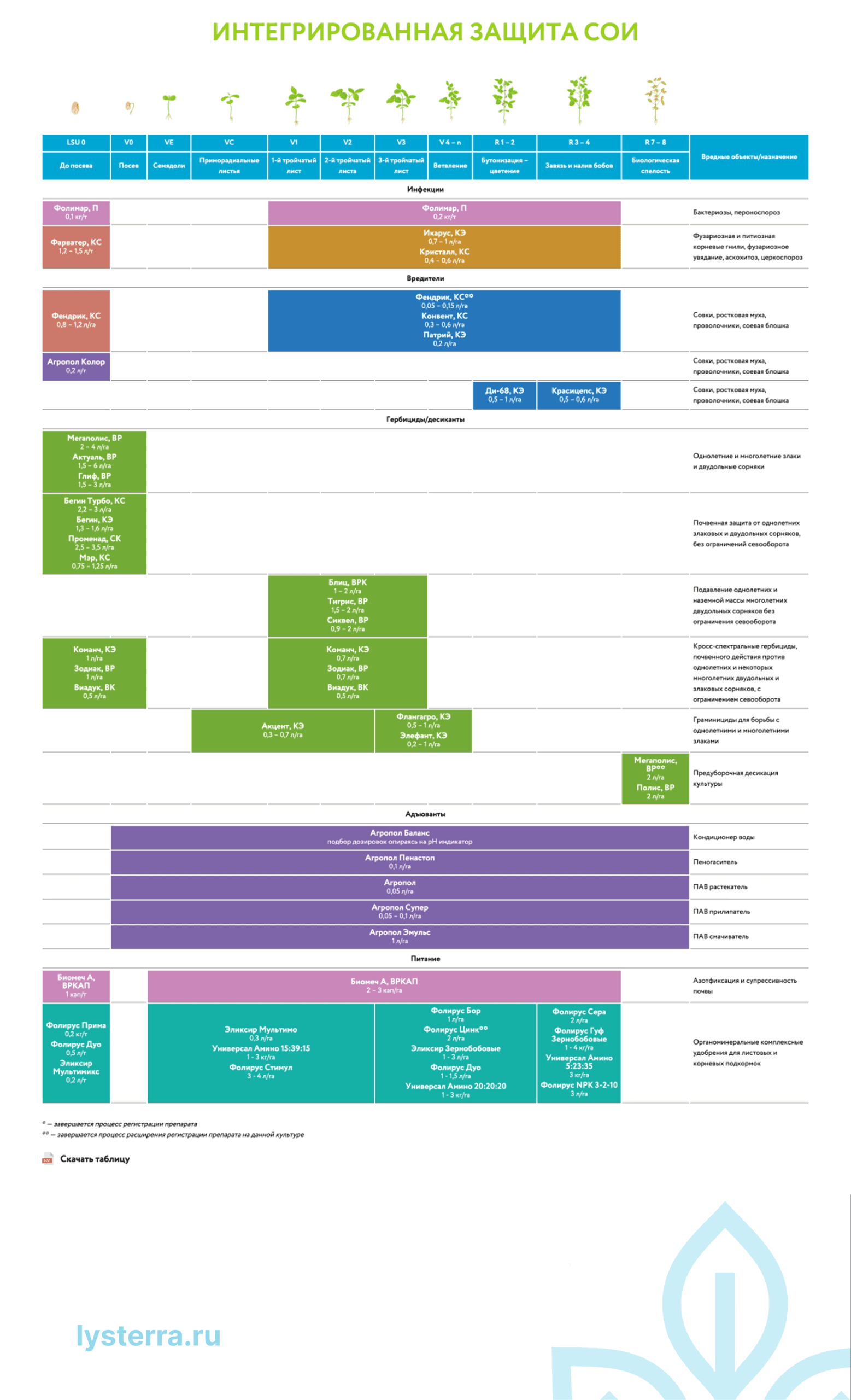 Для защиты семян и всходов от вредителей и болезней рекомендуем использовать инсектицидные и фунгицидные протравители семян сои совместно с ПАВ адъювантами, которые усилят эффективность препаратов.