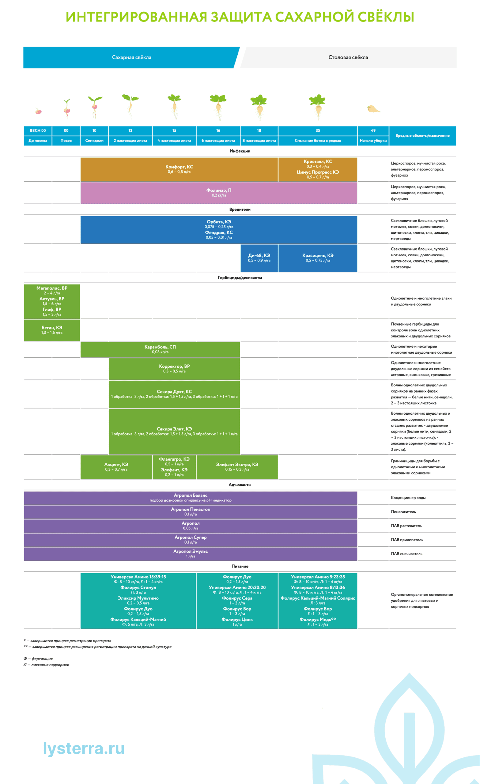 Для защиты свеклы от вредителей и болезней рекомендуем применять инсектициды и фунгициды от Листерра совместно с ПАВ адъювантами. Средства защиты следует подбирать, исходя из типа вредного объекта и текущей фазы развития растения.