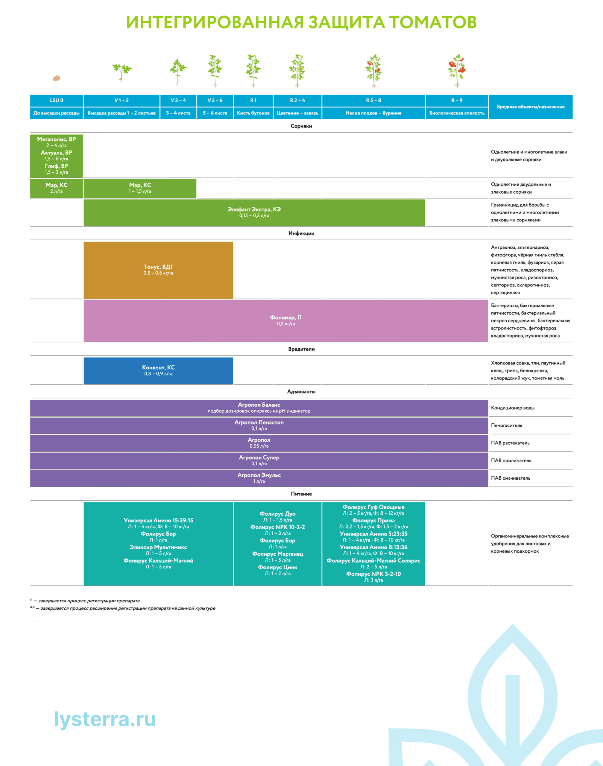 При выращивании в открытом грунте урожайность зависит от условий окружающей среды и технологии возделывания. А значит нужна грамотная система защиты томатов от сорняков, вредителей и болезней. В портфеле компании Листерра есть всё необходимое, чтобы защитить посевы от угроз.