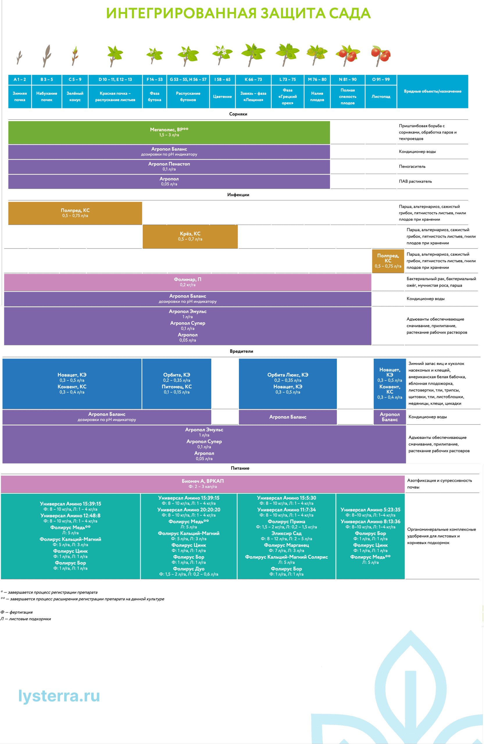 В зависимости от климатических условий местности и фитосанитарного состояния агроценоза сада, для его защиты может проводиться до девяти обработок в год. Для успешной обработки от вредных организмов важно, чтобы система защиты сада была составлена грамотно. Наши специалисты рассказали обо всех этапах ухода, которые необходимы для получения хорошего урожая.