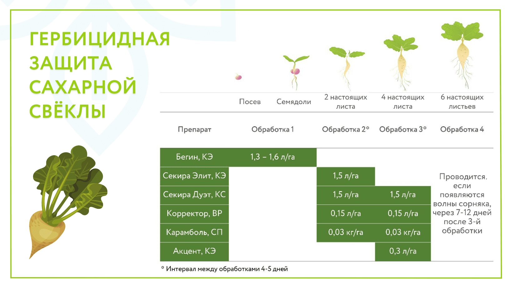 1 обработка включает почвенную защиту сахарной свёклы в фазу посева до всходов семядолей:
