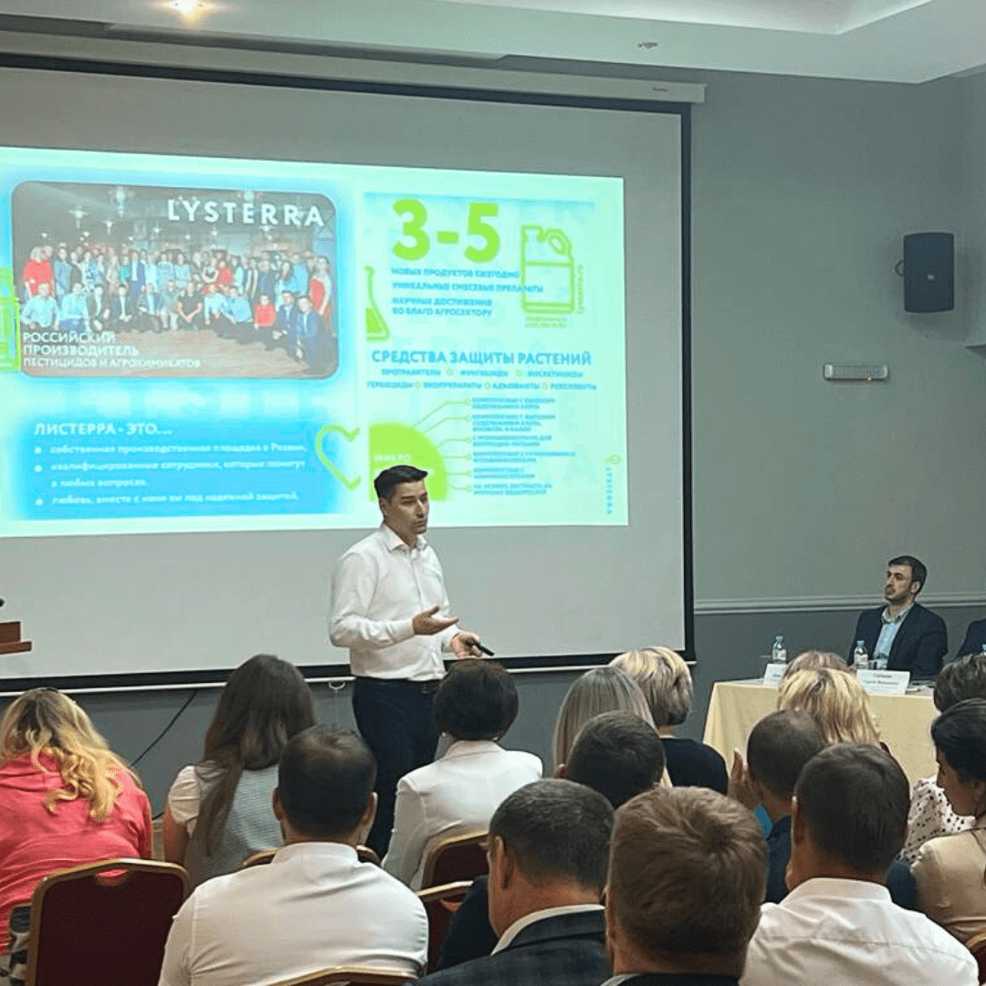 В рамках деловой части программы от компании Листерра выступил международный эксперт по защите растений Евгений Тверских. Он познакомил участников с историей компании, рассказал о доступных вариантах сотрудничества, новых мировых трендах в сельском хозяйстве, а также об инновационных продуктах и технологиях компании. Особый интерес у публики вызвали темы цифровизации информационных систем и роботизации производства, которые обеспечивают комфортные условия для работников компании.
