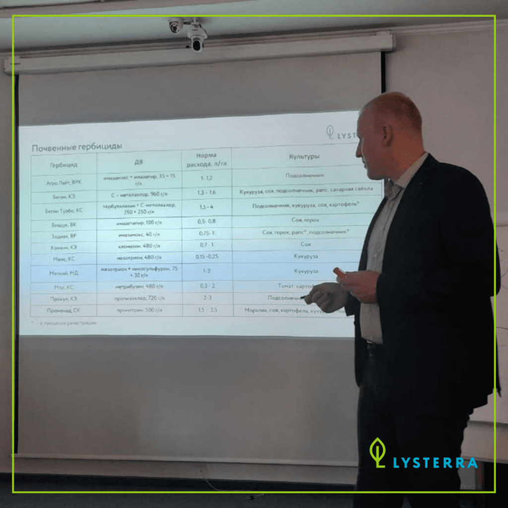 Опытом внедрения в производство почвенных гербицидов в условиях Омской области поделился технический эксперт нашей компании Илья Добренко. Он представил особенно актуальные для местности продукты компании: Меткий, МД, Бегин Турбо, КС, Променад, СК, Мэр, КС, Меис, КС, Команч, КЭ, Прокул, КЭ и рассказал об особенностях приготовления и применения рабочих растворов на таких культурах, как зернобобовые, рапс, кукуруза, подсолнечник, картофель.