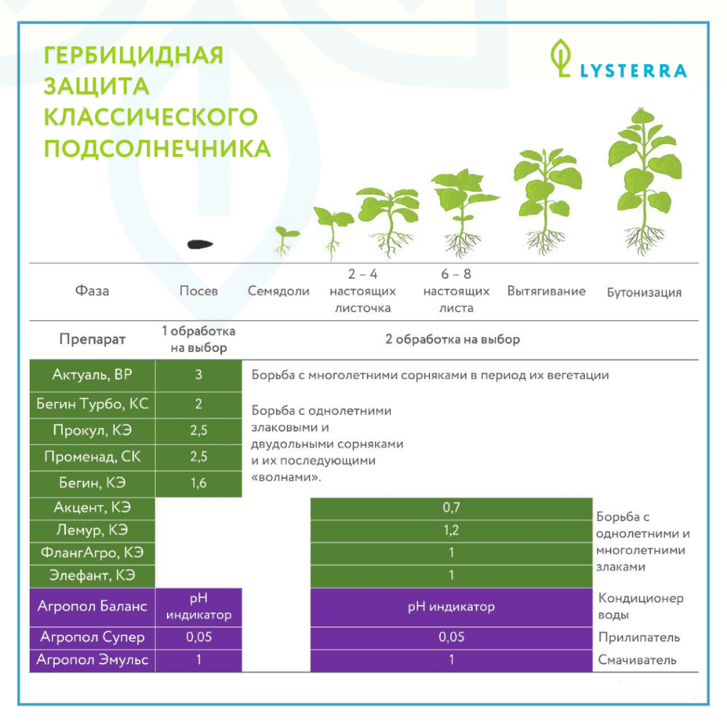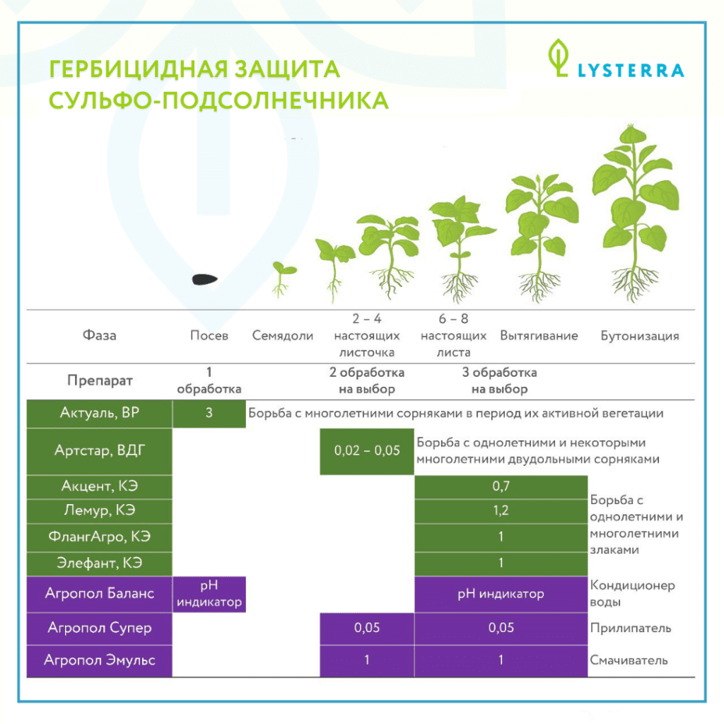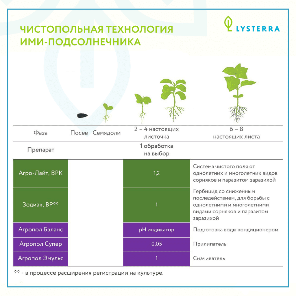 Для данной технологии высевается подсолнечник, устойчивый к имидазолинонам. Рекомендуемые гербициды:
