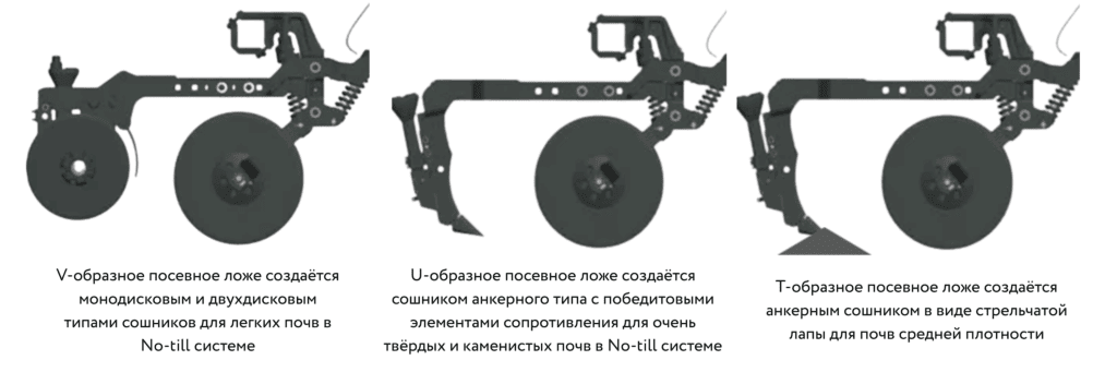 Такие сеялки оснащаются модифицированными сошниками, рассчитанными на работу с конкретными типами почв, и позволяют одновременно с посевом вносить удобрения и мелиоранты непосредственно в зону семенного ложа. Это значительно повышает эффективность посевной и способствует лучшему старту культур в условиях минимальной обработки почвы.