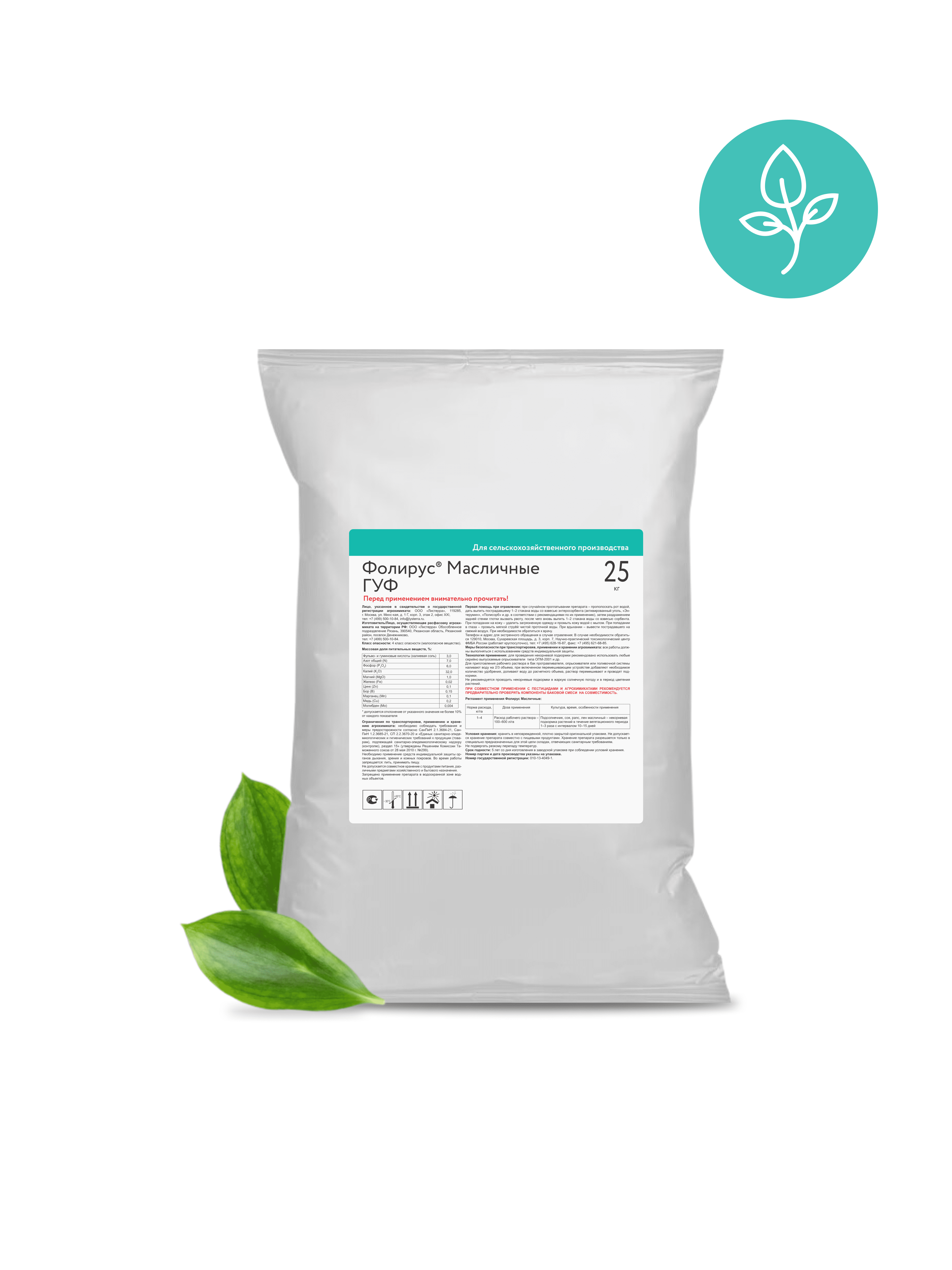 Сухое водорастворимое комплексное удобрение, содержащее макроэлементы (K, N, P), мезоэлементы (S, Mg), набор микроэлементов (Cu, Mn, B, Zn, Fe, Mo), а также комплекс гуминовых и фульвокислот для листового питания масличных культур и поддержания здоровья почвы.